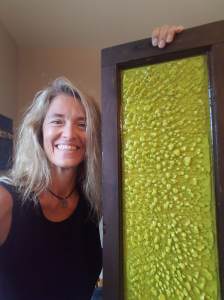 The Found Treasures show includes works that feature encaustic painting. In some of her pieces, she layers encaustic paint over a layer of plaster. She often uses found objects to finish the piece.
